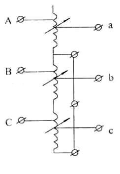 調壓器就是匝數比連續可調的自耦變壓器,當調壓器電刷借助于手輪主軸和刷架的效果,沿線圈的磨光外表滑動時,就可連續地改動匝數比,從而使輸入電壓滑潤地從零調度到值。三相調壓器原理圖如下: