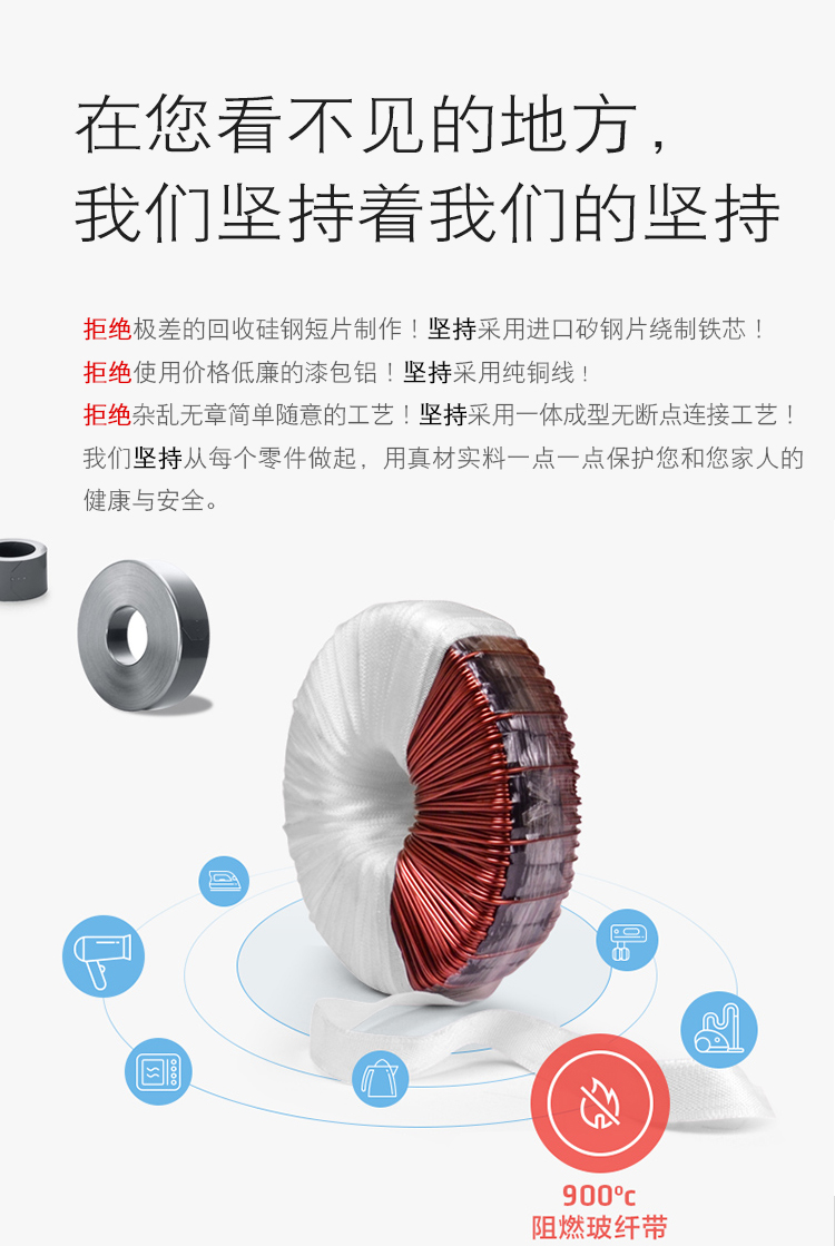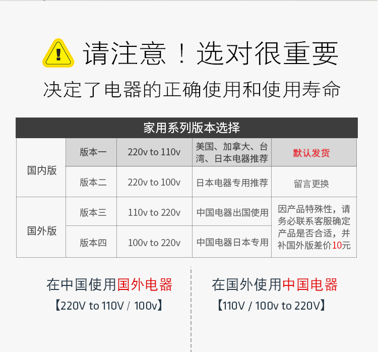注意:選擇220v轉110v變壓器功率容量時應大于電器功率,一般建議預留20%的空間,如果電器是長時間使用(半小時以上)或者電器帶電機、壓縮機的情況,應選擇更大功率容量的變壓器,如不確認請聯系我們在線客服咨詢核實,謝謝。
