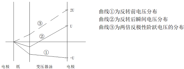 直流的極性反轉試驗可視為在穩定的直流電壓作用下,突然施加兩倍的反向直流電壓,此時,電場分布為直流電壓下的分布與兩倍反極性階躍電壓下的分布的疊加,變壓器油中的場強出現最大值,并很快衰減至穩定直流電壓作用下的場強,而紙板中的場強則低于其穩定直流電壓作用下的場強。電壓分布見圖1-20。
