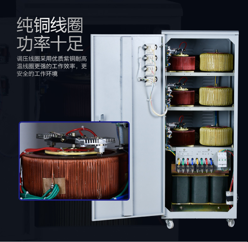 穩變壓器一休機的線圈、鐵芯、硅鋼片等所有組成材料,均采用模組化科學合理設計,并使用高效率及寬范圍工業級零件組合。使該三相變壓穩壓電源免維護、高品質、安全可靠,可承受瞬間高電壓、大電流及適應惡劣的溫度、濕度、震動環境使用。