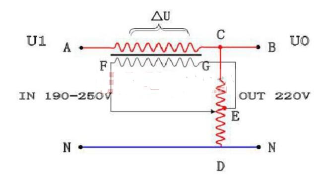 A點為單相穩壓器輸入側,B點為輸出側。其實這一類用調壓器直接調壓式的穩壓器就是利用自耦變壓器的原理做成的。