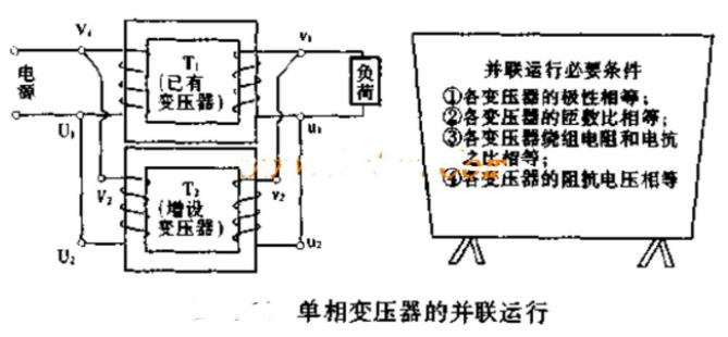 變壓器除了單臺使用外,還使用兩臺以上的變壓器,有時是由于負荷增大需增加變壓器容量,有時是為了達到經濟運行目的,為此,一次側和二次側各都按并聯接線。稱此為變壓器并聯運行(參看下圖 )。