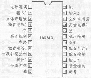 LM4610N/LM4610采用24腳雙列直插式封裝,其引腳及功能如下:2腳和23腳,信號輸人端;3腳和22腳,3D聲場處 理控制端(兩腳通過電容相連,起3D聲場處理作用);4腳和21腳,接高音提升電容(0.01μF);6腳, 高音控制輸人端;8腳和17腳,接低音提升電容(0.39~O.47μF),改變高、低音的電容可改變高、低音 的音調反應;10腳和15腳,信號輸入端;11腳,平衡控制輸入端;12腳和24腳,電源地;13腳,正電源端 ;14腳,音量控制輸入端;16腳,低音控制輸人端。