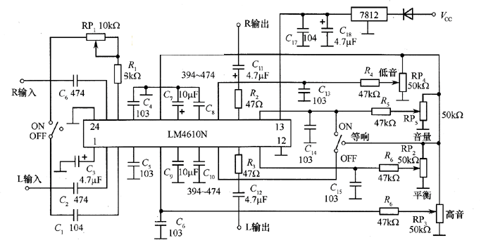 如圖2所示為LM4610N/LM4610的應用電路。此電路具有響度調節(jié)、低音調節(jié)、高音調節(jié)、音量調節(jié)、左右聲道平 衡調節(jié)等。