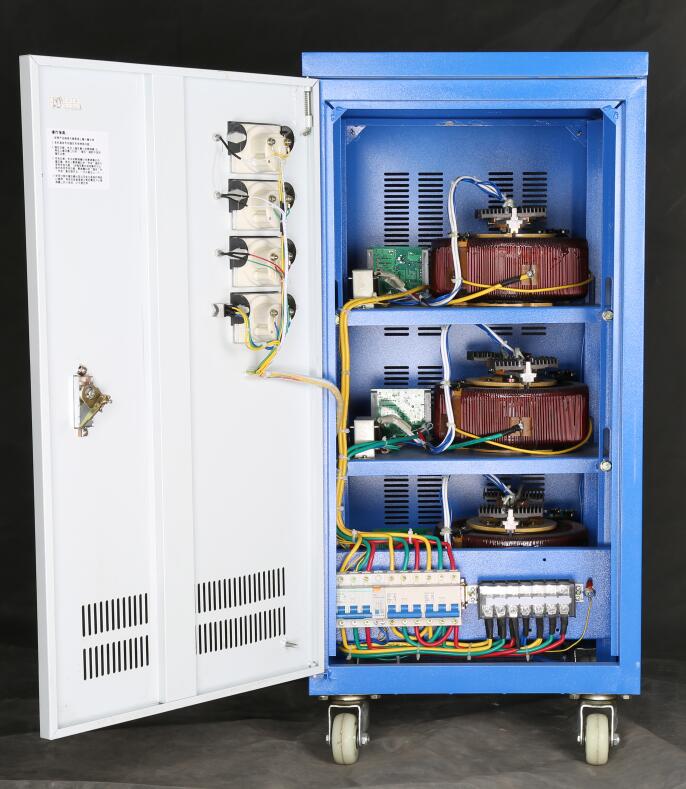 三相穩壓器實際就是把三個穩壓單元用”Y”形接法聯接在一起.再用控制電路板和電機驅動系統來控制調壓變壓器,達到穩定輸出電壓的功能.如果三個調壓變壓器的滑臂都是由一個電機來驅動的調壓方式為統調穩壓器.如果三個調壓變壓器的滑臂由三個電機來獨立調整的穩壓器就是三相分調式穩壓器.它們的工作原理同單相的穩壓器完全相同。