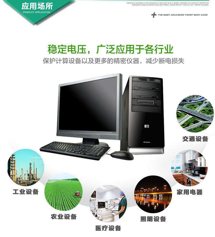 計算機行業、測試設備、照明系統、通訊系統、醫療設備、工業自動化設備、 音響 設備等用電場所,工礦企業、油田、鐵路、建筑工地、家用、學校、 醫院 、郵電、 賓館 、科研等部 門 的電子計算機、精密機 床 、計算機斷層掃描攝影(CT)、精密儀器、試驗裝置、 電梯 照明、進口設備及生產流水線等需要電源穩定電壓的場所。