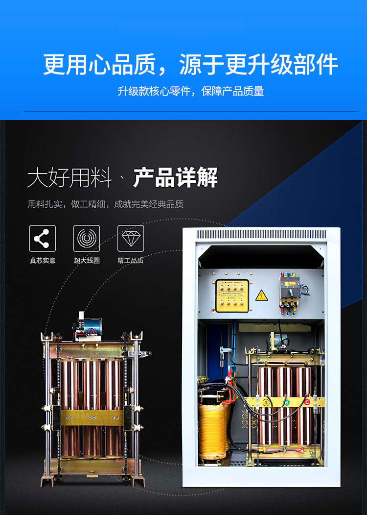 采用芯片技術、智能化控制、替代了傳統的機械傳動,碳刷調壓的模式,并且三相獨立調整,保證各相電壓的穩定精度。真正實現了無觸點、無機械傳動免維護;高效率、高精度、高響應速度、三相電壓平衡、無波形畸變。該產品是理想的高端電源穩壓設備。該技術填補了國內高精度、無觸點穩壓器的空白,扭轉了國內高端穩壓電源依賴進口的局面。歡迎來電我公司咨詢三相穩壓器、交流穩壓器、無觸電穩壓器相關信息!