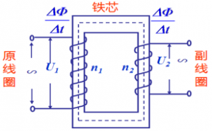 當原線圈通有交流電,會在鐵芯內產生變化的磁場,副線圈處在鐵芯的磁場內,將產生感應電流(互感現象),原副線圈的磁場變化情況是一樣的,所以原副線圈的ΔΦ/Δt相同(忽略磁場能損失)。