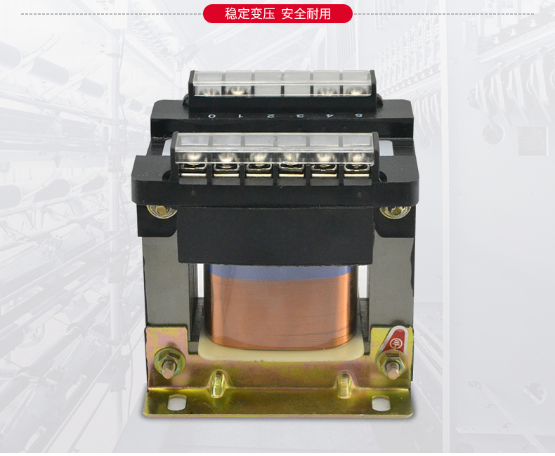 該變壓器可作機床或機械設備中的一般電路的控制電路,局部照明及指示燈的電源之用。該變壓器做成開啟式,由硅鋼片、鐵芯加線圈組合而成,初次級繞組分開繞制,次級繞組的電壓及容量按用戶需要任意選擇,但原則上不得多于三個繞組,變壓器有專用接地螺釘和明顯接地標志,接線采用瓦型墊圈組合螺釘;接線端子采用防護型,防止手指觸及帶電部位。
